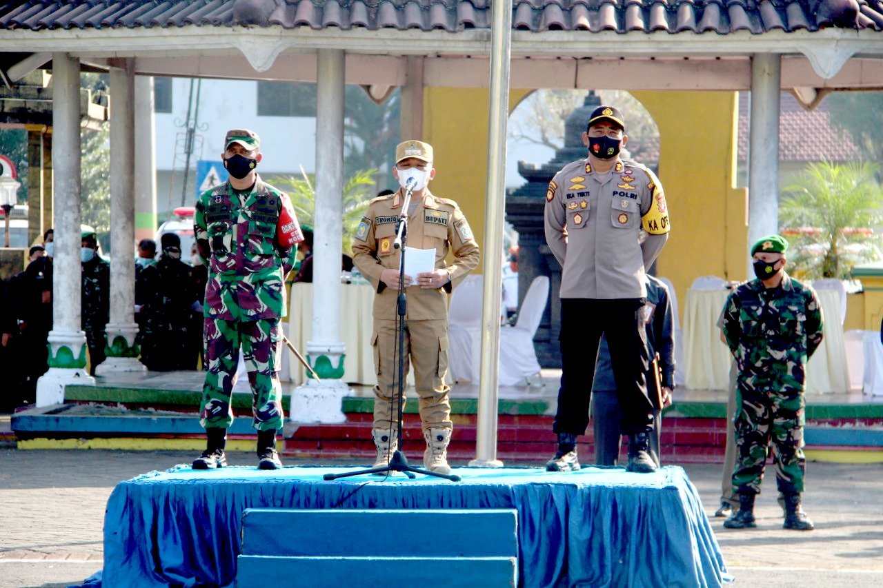 LUMAJANG.SGI.15/06/2021. Forkopimda Kabupaten Lumajang menggelar Apel gelar pasukan penegakan disiplin Protokol kesehatan dalam rangka mencegah penyebaran virus Corona Covid-19 di Kabupaten Lumajang dengan melaksanakan 3M ( memakai Masker, Mencuci tangan, dan menjaga jarak ) dan 3T ( Tracing, Testing dan Treatmen ), Selasa (15/6/2021).