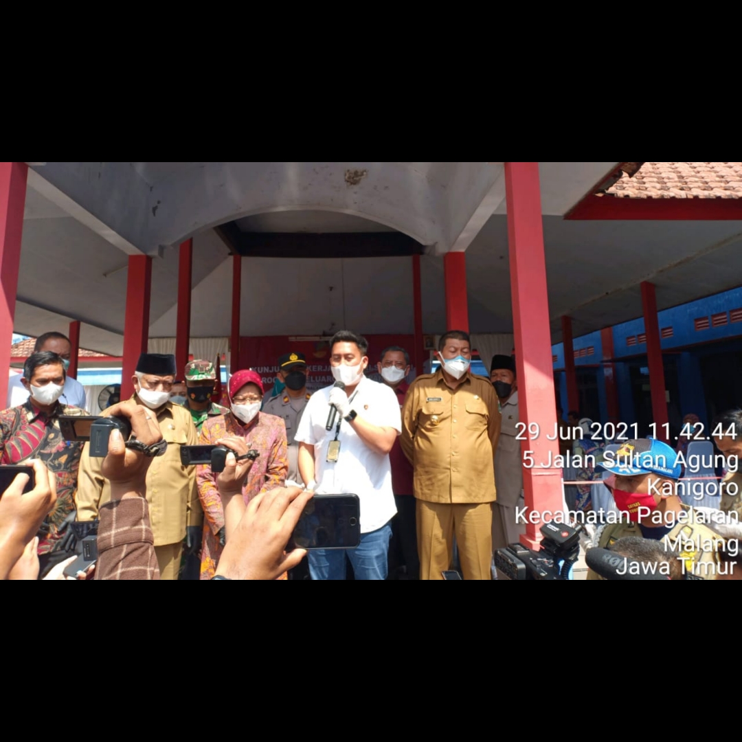 Malang.SGI.29/06/2021. Kunjungan Kerja Menteri Sosial Republik Indonesia Dr. Ir. Tri Rismaharini beserta rombongan di Balai Desa Kanigoro, dalam rangka memberikan bantuan penyerahan Kartu Keluarga Sejahtera (KKS) ke Keluarga Penerima Manfaat (KPM) Program Keluarga Harapan (PKH) Desa Kanigoro Kecamatan Pagelaran Kabupaten Malang, serta tindak lanjut penyalahgunaan dari pendamping program keluarga harapan (PKH). Selasa (29/6/2021).