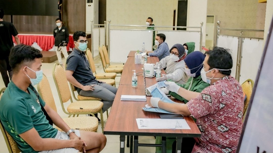 Riono menambahkan, sebanyak 23 orang pemain dan juga 4 orang pelatih yang mendapatkan vaksin dan Swab kali ini,satu persatu para pemain dan pelatih melakukan screening kesehatan lalu di vaksin dan Swab test.(ron.SGI).
