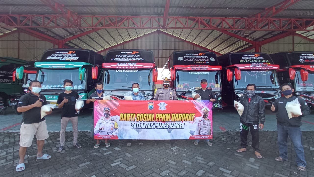 Jember.SGI. Jajaran Satuan Lalu Lintas Polres Jember melaksanakan kegiatan bhakti sosial PPKM Darurat Covid-19 dengan membagikan paket sembako, dan memberikan edukasi pencegahan covid-19 kepada Kru PO Bus Inds 88 Trans Jember, yang berada di Jl. Wolter Monginsidi, Kelurahan Kranjingan, Sumbersari, Jember. Senin (12/7/2021)