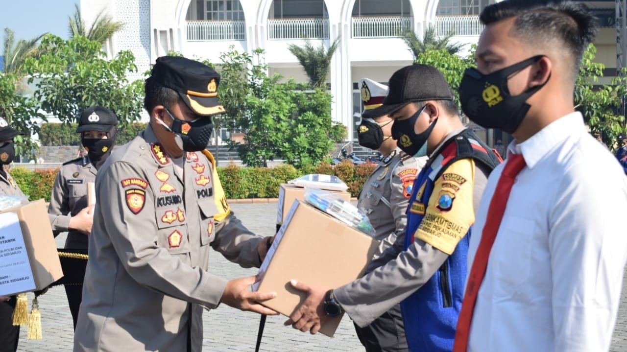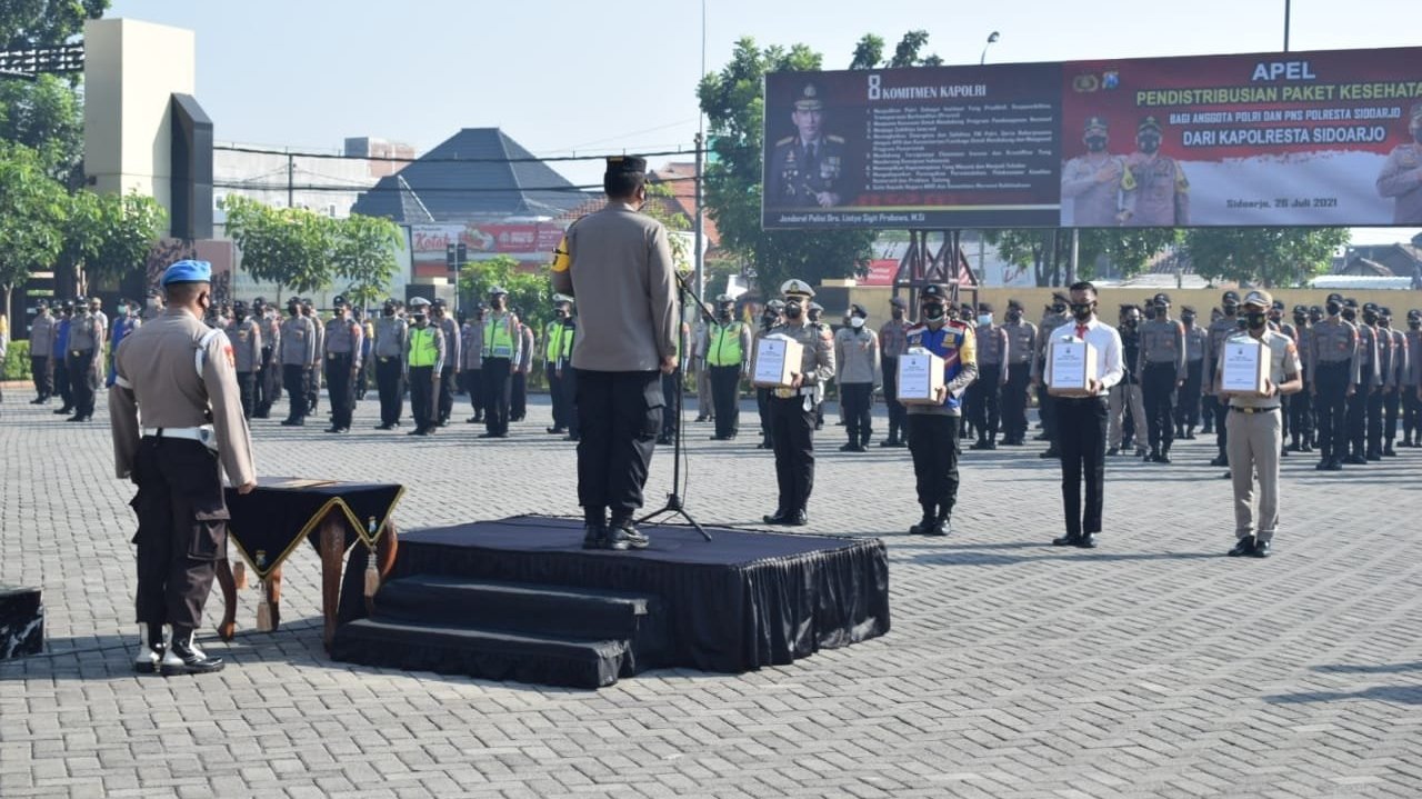 Sidoarjo.SGI. Kapolresta Sidoarjo Kombes Pol. Kusumo Wahyu Bintoro salurkan paket kesehatan bagi anggota Polri dan ASN di lingkup Polresta Sidoarjo serta Polsek jajaran, dalam apel Senin (26/7/2021) pagi di Mapolresta Sidoarjo.