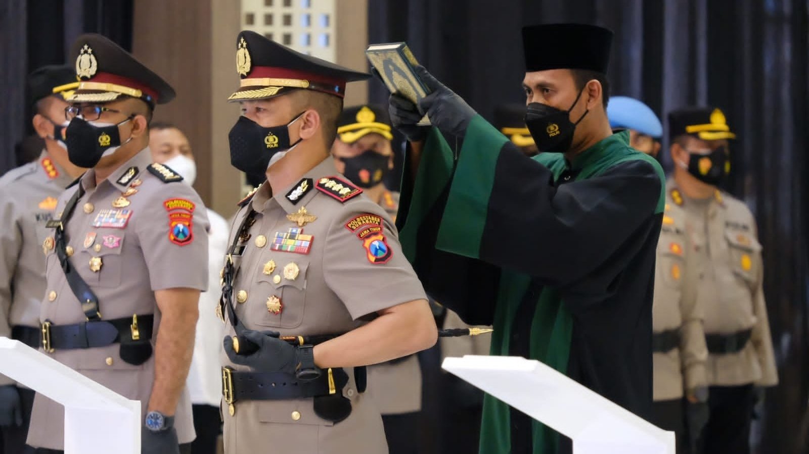 Ada sebelas pejabat polda jawa timur berikut kapolres/ta jajaran polda jatim yang mengikuti serah terima jabatan.