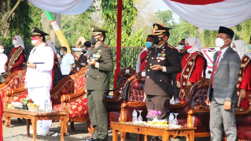 Lampung Timur.SGI. Komandan Kodim 0429/Lamtim Letkol Kav. Muhammad Darwis bersama jajaran Forkopimda menghadiri upacara peringatan HUT RI ke-76 yang berlangsung terbatas, bertempat di Lapangan Apel Pemkab Lampung Timur, Selasa (17/8/2021).