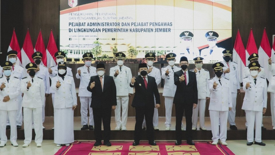 Jember.SGI. Pejabat Administrator dan Pengawas Pemkab Jember resmi telah dilantik oleh Bupati, dalam kesempatan ini Bupati Hendy melantik dan mengambil sumpah berjumlah 132 orang pejabat dengan rincian 77 pejabat administrator dan 55 pejabat pengawas, Jumat 20/08/2021.