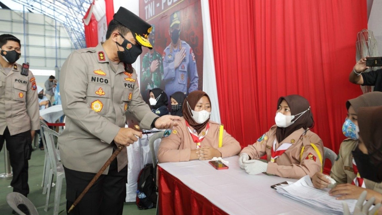 Bojonegoro.SGI. Kapolda Jawa Timur Irjen Pol Nico Afinta, bersama Pejabat Utama Polda Jatim, melakukan pengecekan vaksinasi merdeka semeru, bagi masyarakat umum dan anak usia 12 tahun ke atas, pada Minggu (22/8/2021), di Mapolres Bojonegoro. Kegiatan ini bertujuan untuk mempercepat program pemerintah, dalam membentuk herd immunity di Jatim.