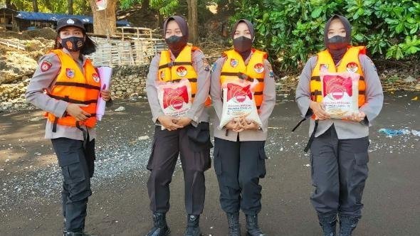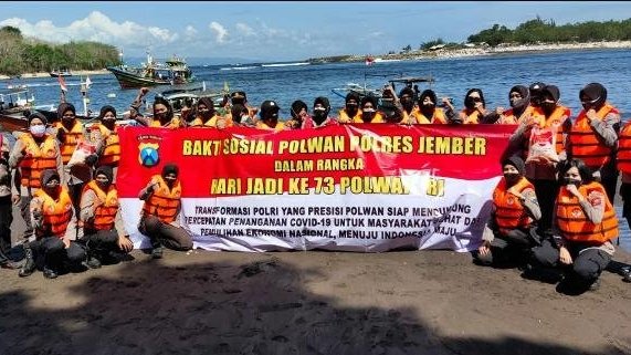 JEMBER.SGI. Dalam Rangka HUT Polwan ke 73, Polwan Polres Jember Bedagai melaksanakan bakti sosial kepada masyarakat kurang mampu di Pantai Pancer Desa Puger Kulon Kec. Puger Kabupaten Jember, Sabtu (28/08/2021).