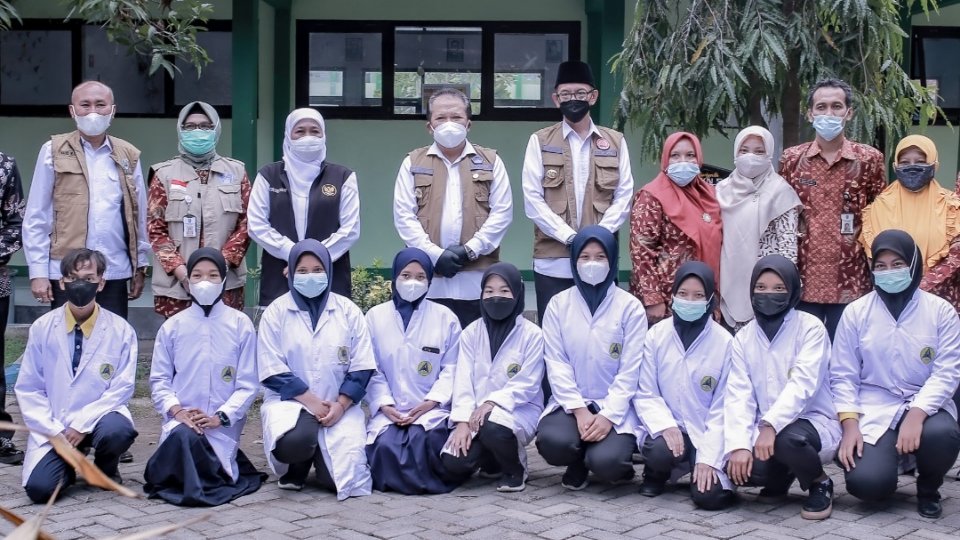 JEMBER.SGI. kunjungan Gubernur Jawa Timur Khofifah Indar Parawansa di Kabupaten Jember pada hari kedua diisi dengan kegiatan peninjauan langsung pelaksanaan vaksinasi untuk pelajar di SMKN 5 Jember, Kamis (2/9/2021).