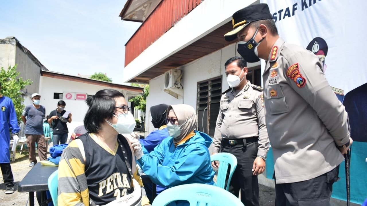 Kapolresta Sidoarjo Kombes Pol. Kusumo Wahyu Bintoro turun langsung memantau jalannya vaksinasi Covid-19 bagi pengurus, jemaat dan warga sekitar GKJW Sidoarjo.