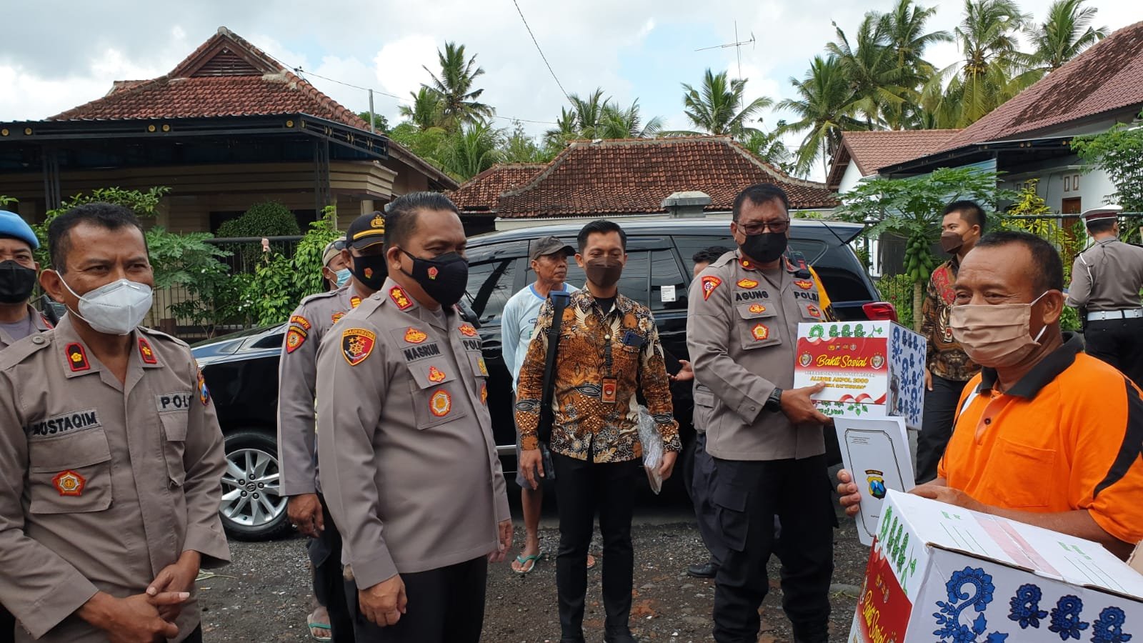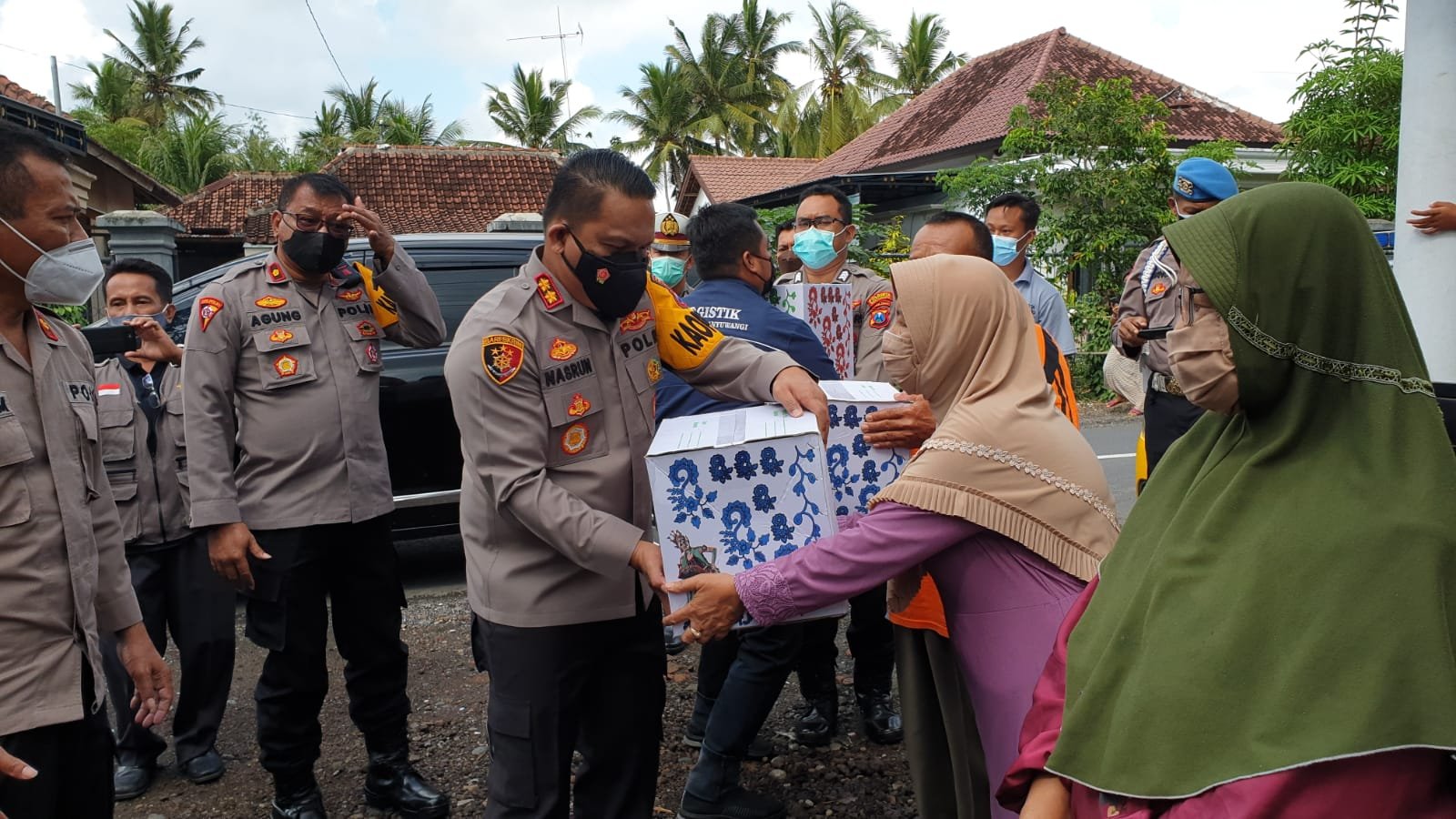 Kepolisian Resor Kota (Polresta) Banyuwangi dan para pejabat utama membagikan bantuan berupa paket Sembako ke rumah-rumah warga yang terdampak puting beliung di Desa Bagorejo.