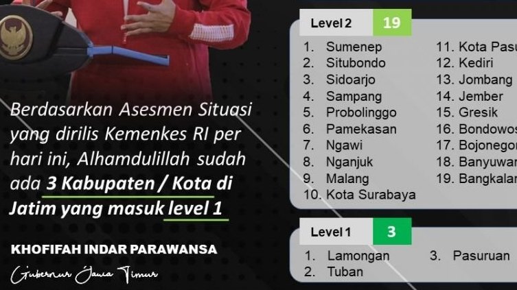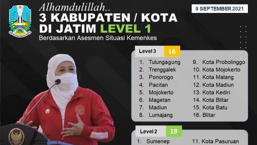 Tuban SGI. Per 9 September 2021 kabupaten Tuban masuk dalam PPKM Level 1. Hal tersebut berdasarkan assessment situasi yang dirilis Kemenkes RI, dimana terdapat tiga kabupaten di Jawa timur yang telah masuk dalam PPKM Level 1 yaitu, Tuban, Pasuruan, dan Lamongan.