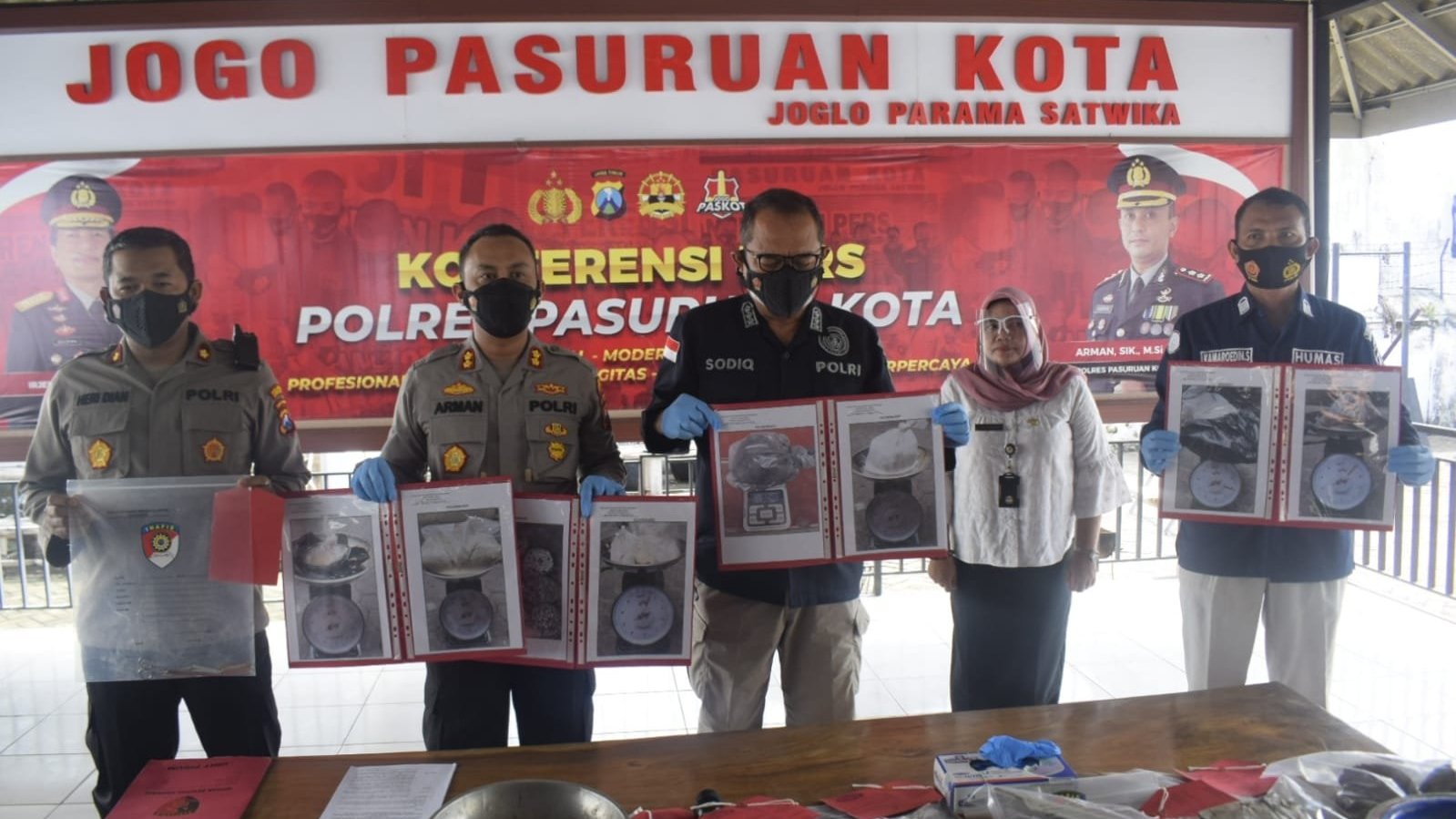 Pasuruan.SGI. Polres Pasuruan Kota tetapkan 4 tersangka, perakit dan penjual bom ikan yang telah menewaskan dua orang warga Pasuruan. Hal ini disampaikan Kapolres Pasuruan Kota AKBP Arman, bersama Kabidlabfor Polda Jatim Kombes Pol Sodiq Pratomo, dan Kasat Reskrim serta Kasi Humas Polres Pasuruan Kota, saat jumpa pers, pada Rabu (15/9/2021), di Joglo Parama Satwika Polres Pasuruan Kota.