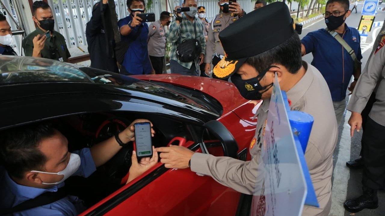 Satu persatu baik pengendara roda dua maupun roda empat, sebelum masuk ke Markas Polisi Daerah Jawa Timur (Mapolda Jatim) Diwajibkan untuk mendownload Aplikasi pedulilindungi kemudian men-scan barcode.