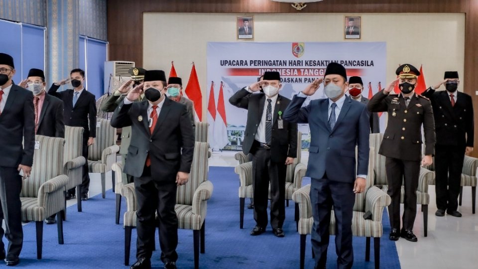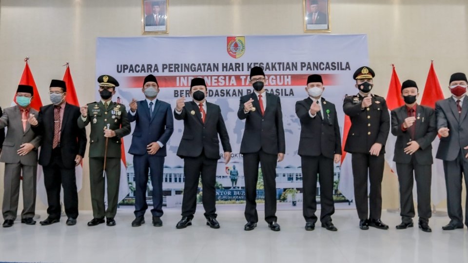 JEMBER.SGI. Bupati Jember Ir. H. Hendy Siswanto dan Wabup Jember KH MB Firjaun Barlaman beserta seluruh jajaran Forkopimda Jember mengikuti secara daring upacara Hari Kesaktian Pancasila yang dipimpin oleh Presiden Republik Indonesia Ir. H. Joko Widodo dari Istana Negara, Jumat (01/10/2021).