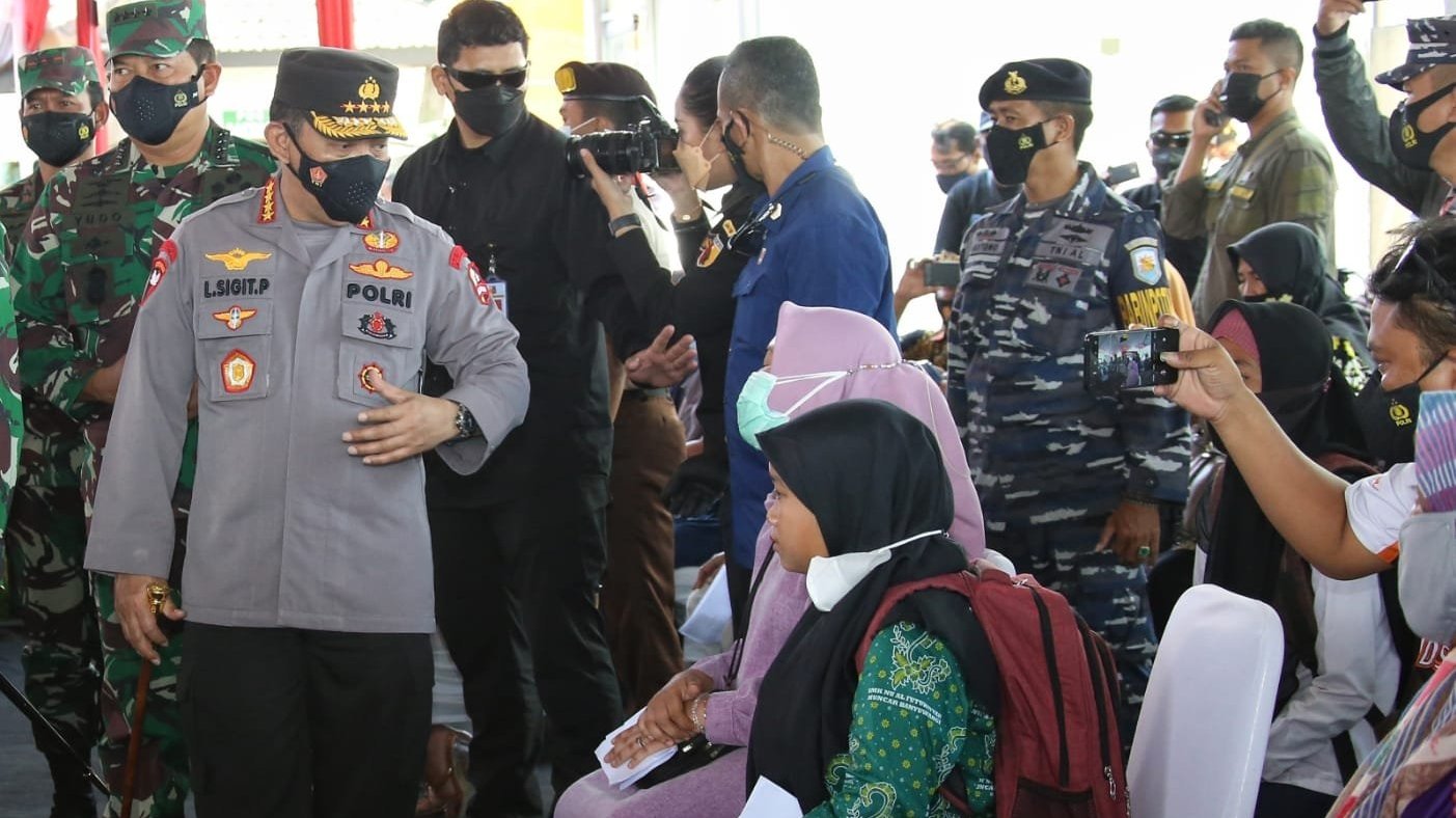 “Dan kemudian terkait vaksinasi harus kami tingkatkan dan percepat. Sehingga kemudian seluruh masyarakat Indonesia yang diharapkan Bapak Presiden minimal 70 persen bisa tercapai,” kata Sigit dalam jumpa pers usai meninjau serbuan vaksinasi.