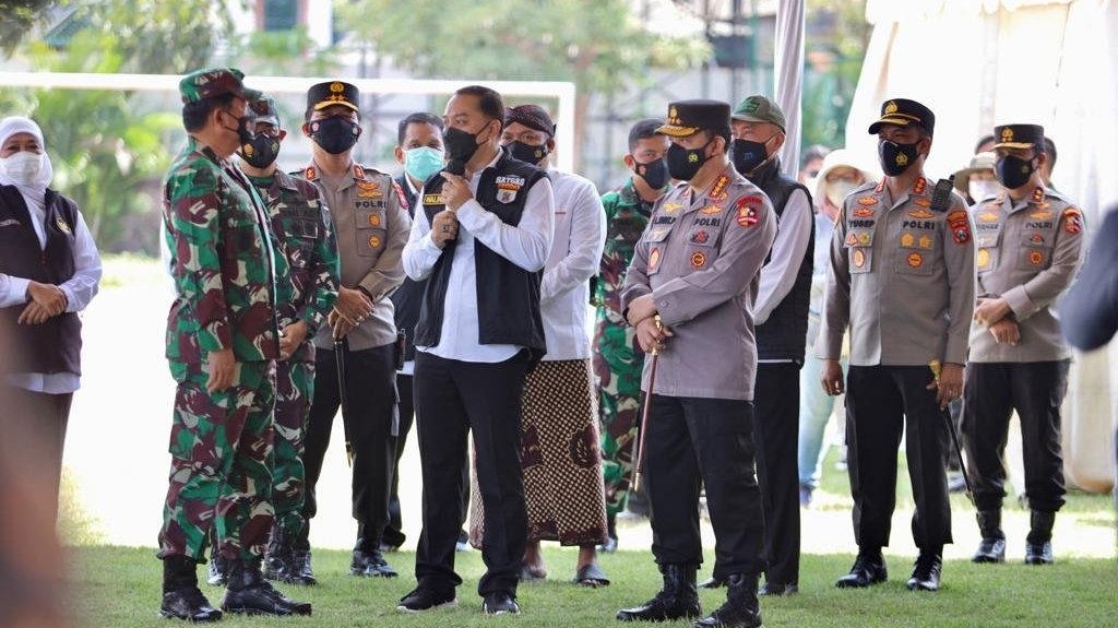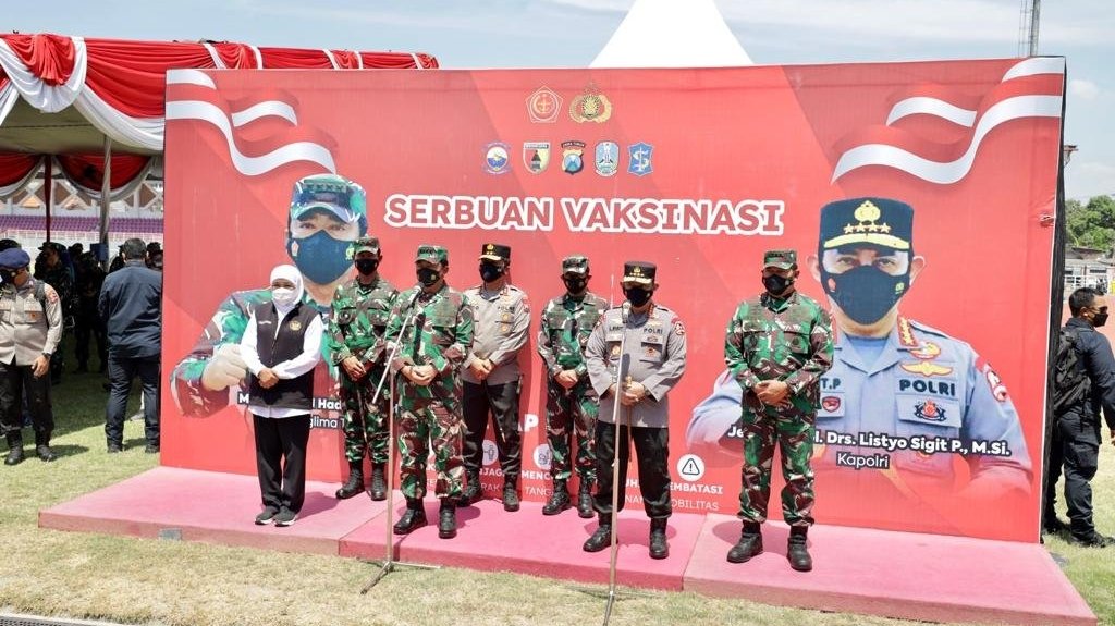 Gubernur Jatim Khofifah Indar Parawansa, Pangdam V Brawijaya Mayjend TNI Suharyanto, dan Kapolda Jatim Irjen Pol Nico Afinta bersama Forkopimda kota Surabaya, mendampingi Panglima TNI Marsekal Hadi Tjahjanto, Kepala Staf TNI Angkatan Laut (KASAL) Laksamana TNI Yudo Margono dan Kapolri Jenderal Listyo Sigit Prabowo melakukan pengecekan Serbuan Vaksinasi di Surabaya, dan daerah lain yang melaksanakan vaksinasi di Jawa Timur.