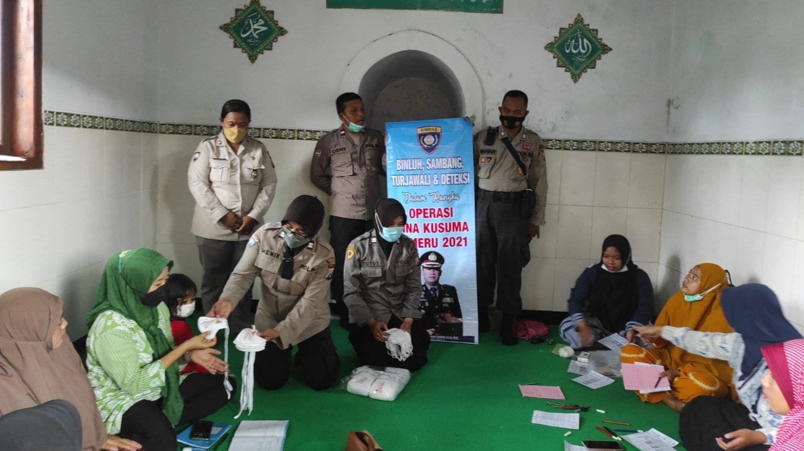 Jember.SGI. Dalam rangka minimalisir penyebaran Covid-19 dan mendukung percepatan vaksinasi, Kaurmintu Satbinmas Aipda Henik Aniyah bersama Anggota Binmas Polres Jember melaksanakan sosialisasi dan mengedukasi tentang pentingnya vaksinasi serta mengajak agar mematuhi protokol kesehatan dalam rangka Ops Bina Kusuma Semeru 2021. (28/10/2021)