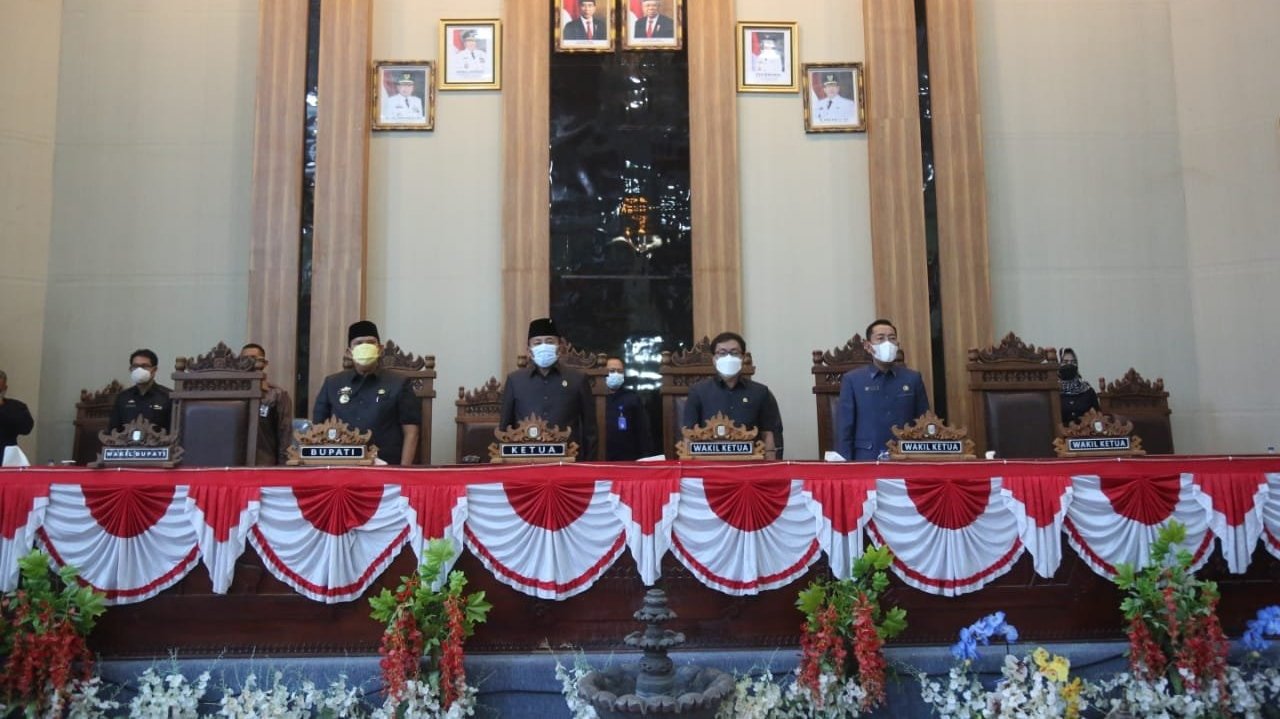 LAMTIM.SGI. Wakil Bupati Lampung Timur Azwar Hadi Mengahadiri Rapat Paripurna DPRD TK.II Kabupaten Lampung Timur Dalam Acara Penandatanganan Nota Kesepakatan Bersama Terhadap Kebijakan Umum APBD dan Prioritas Plafon Anggaran Sementara (KUA dan PPAS) TA. 2022 di Ruang Sidang DPRD Kabupaten Lampung Timur, Selasa (16 November 2021).