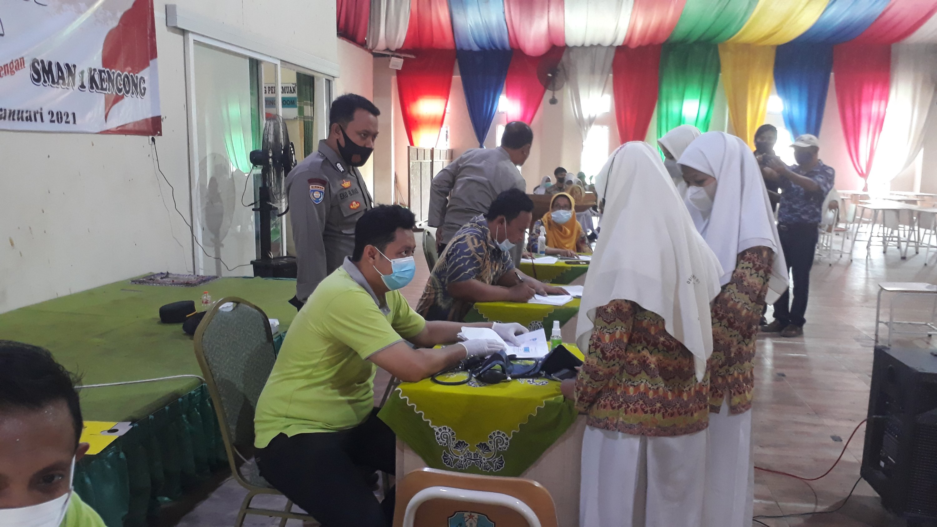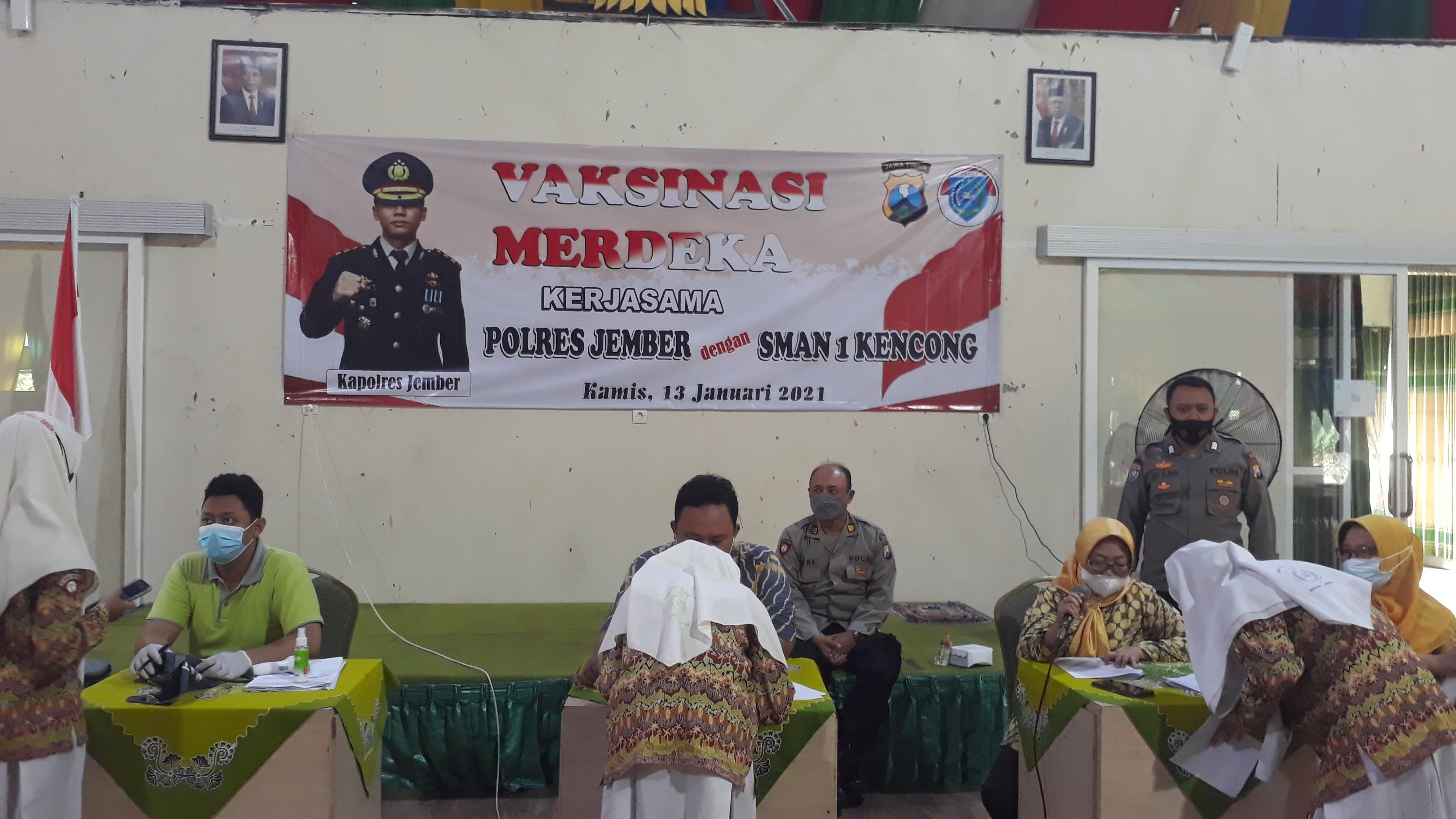 Jember.SGI. SMAN 1 Kencong mengelar kegiatan percepatan vaksin dosis 1 dan 2 untuk siswa siswinya, Rabu 13/01/2022, kegiatan dilaksanakan di aula gedung lantai dua, vaksin di dapat dari Program Kapolres Jember yaitu Program Vaksin Merdeka.