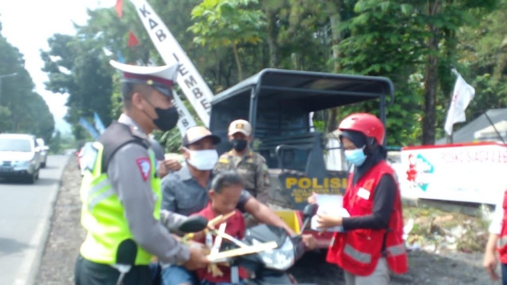 Di saat turun ke lapangan, posko mobile lebaran PMI membagikan masker kepada masyarakat. Pembagian Masker dilakukan di Pos Tawang Alun sebanyak 15 pcs, Pos Klinik Pratama 7 pcs, Pos Garahan 11 pcs, dan Pos Mobile sebanyak 13 pcs. “Kita juga bagikan masker karena pandemic COVID-19 masih belum berakhir sehingga tetap harus waspada,” imbuhnya.