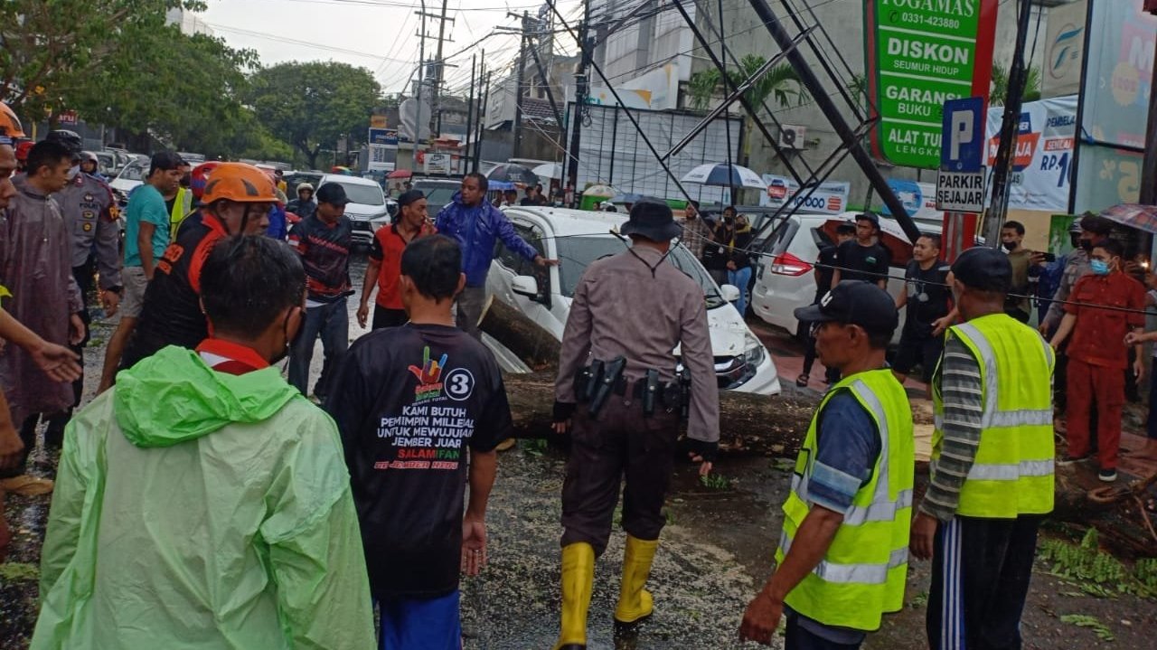 Robohnya pohon di jalan poros kota tersebut, tak ayal membuat jalan satu jalur di timur kantor Bupati tersebut mengalami macet total hingga sampai SMP 2 Negeri Jember di Jalan PB. Sudirman.