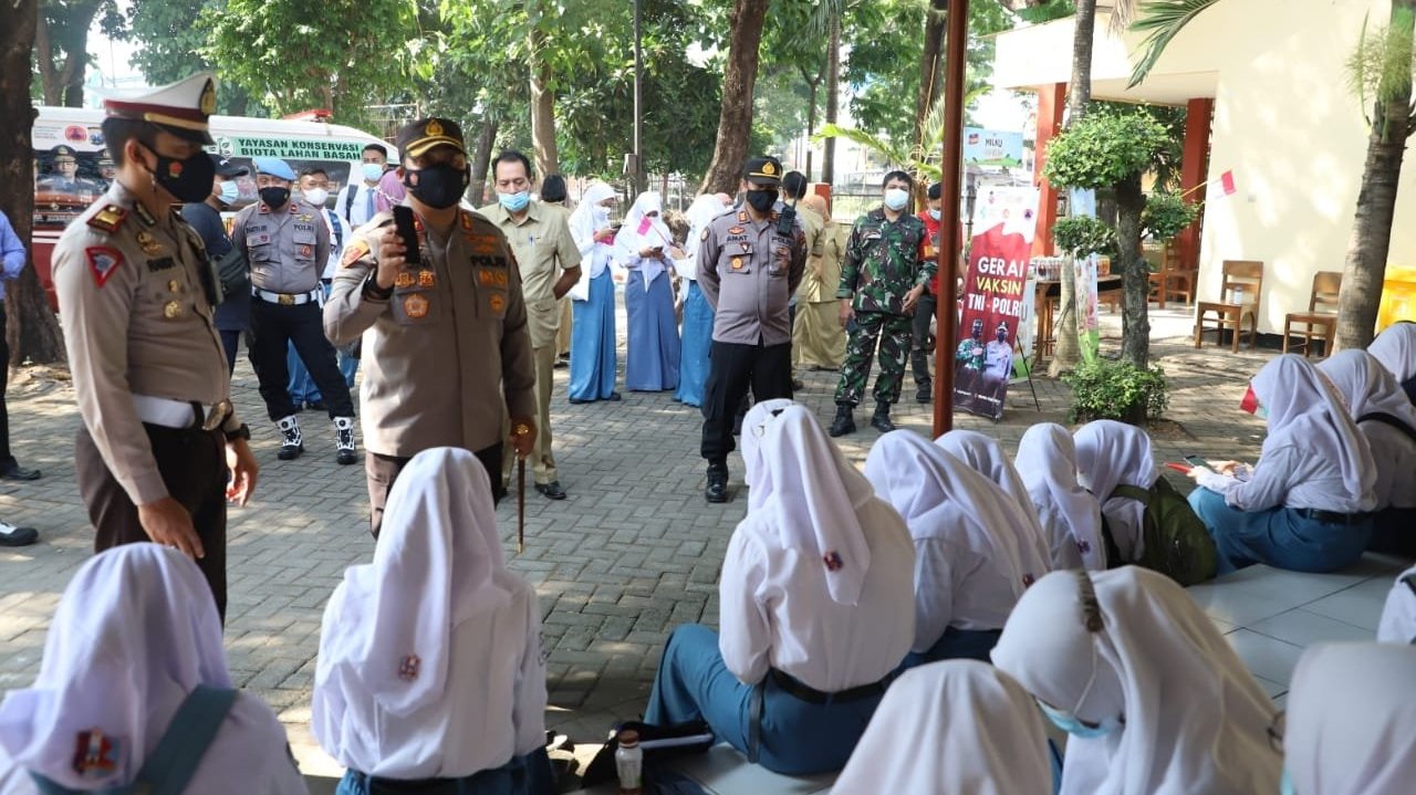 Mojokerto.SGI. Sasar ratusan pelajar Sekolah Menengah Atas, Polres Mojokerto kembali menggelar vaksinasi Putih Abu-abu di SMAN 1 Sooko di Kecamatan Sooko, Kabupaten Mojokerto. Dalam kesempatan ini, Kapolres Mojokerto AKBP Dony Alexander, S.I.K., M.H. juga mensosialisasikan aplikasi PeduliLindungi, Selasa (24/08).